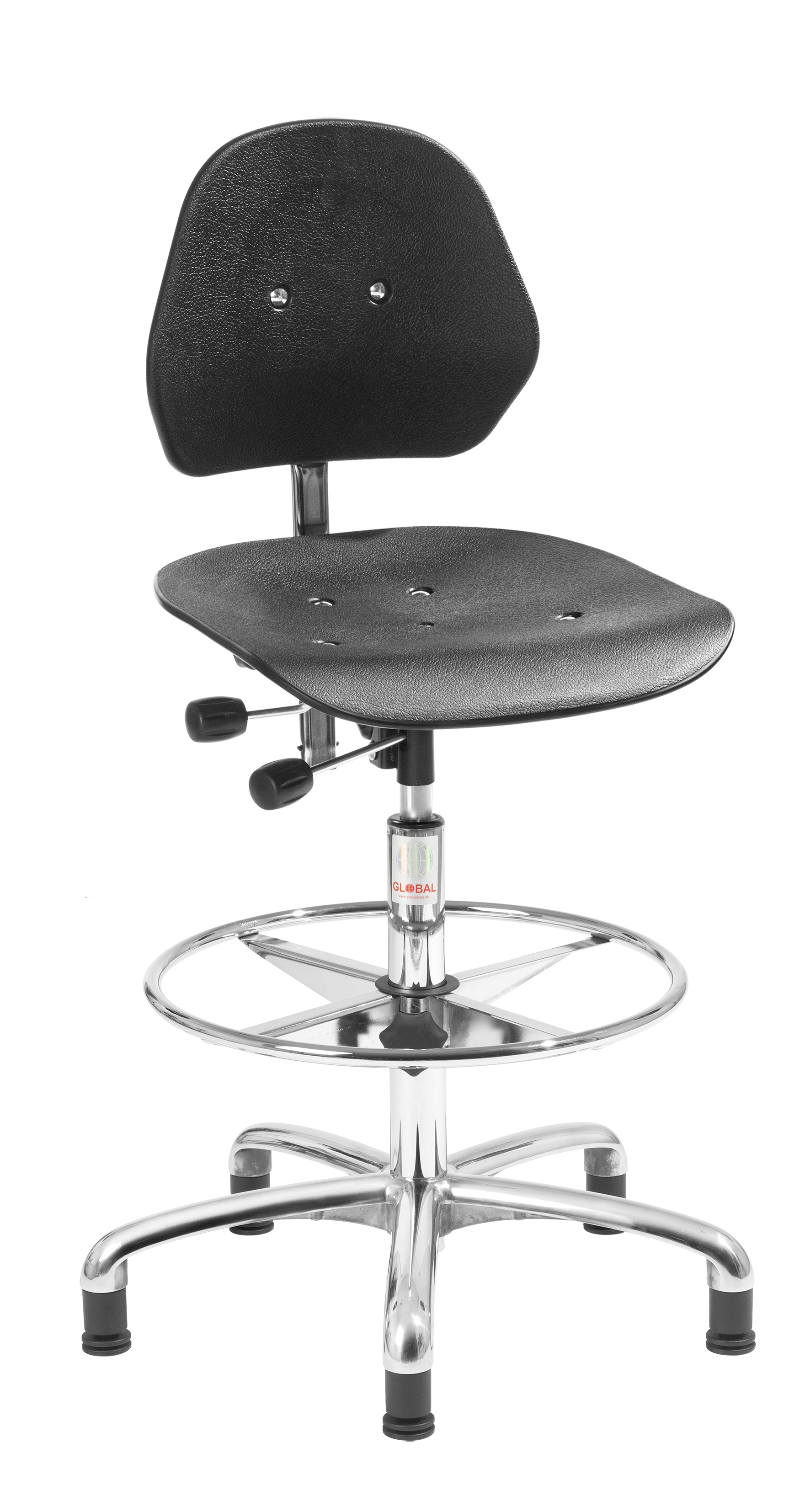 The chair is equipped with a 610 mm aluminium base, foot ring and 50 mm ESD glides, ensuring stability and secure positioning at the workstation.